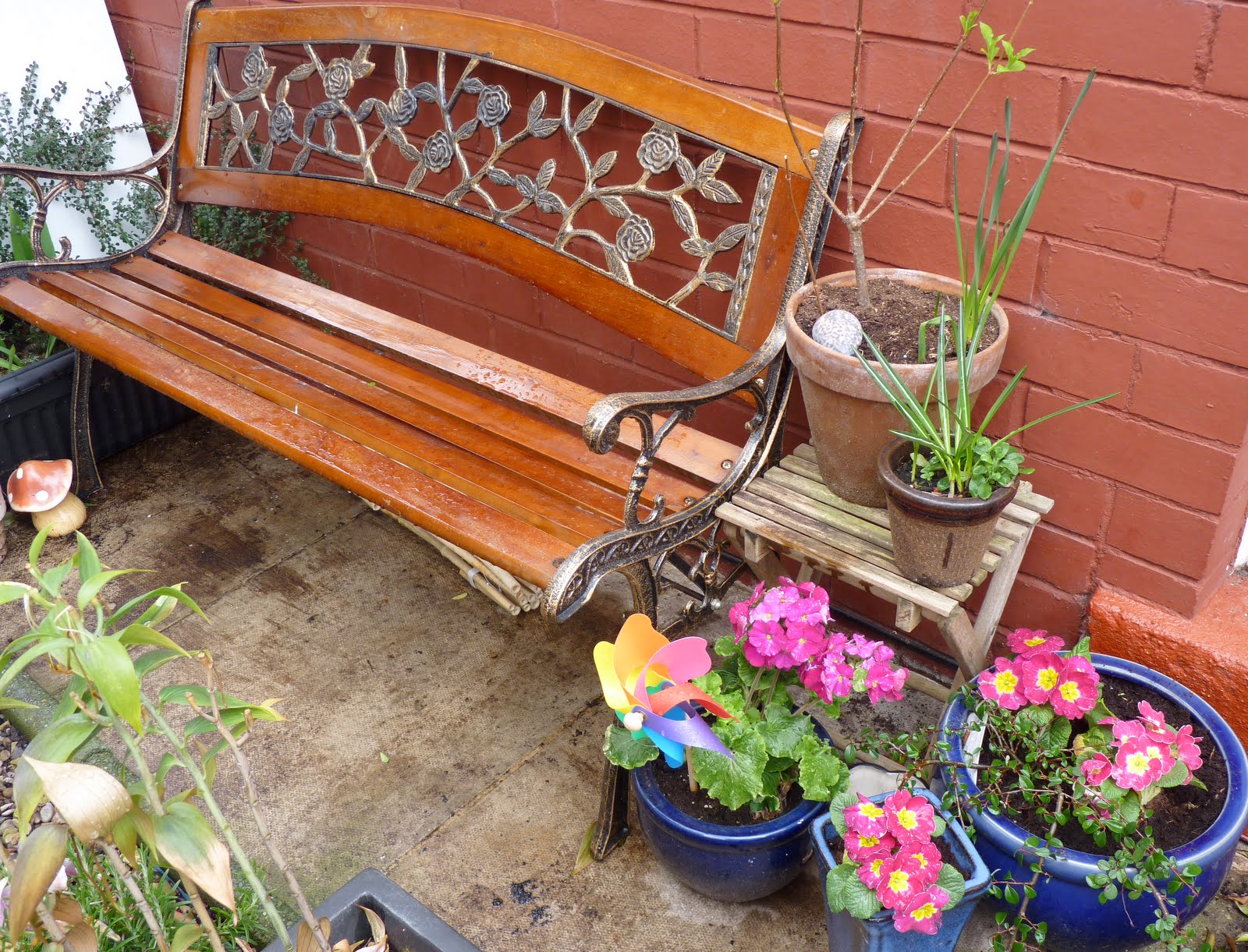 Bearing in mind this is a seriously small garden I think it's looking OK at the moment (this half widthwise is what you see, plus maybe 6 inches behind the white board to the left - the red bit behind the round blue pot is my doorstep. I have the same again on the other side and that's it).